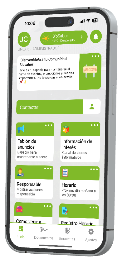 La aplicación Comunidad Biosabor está diseñada para simplificar tu vida laboral. Con ella, tendrás acceso rápido y seguro a tus documentos, podrás firmarlos en línea con facilidad y mantenerte al día con las últimas noticias y novedades de la empresa.